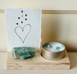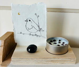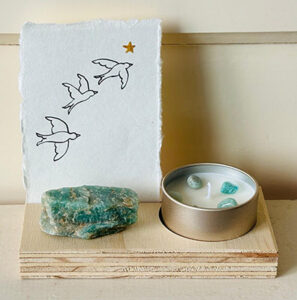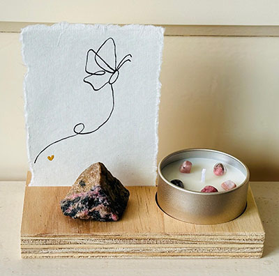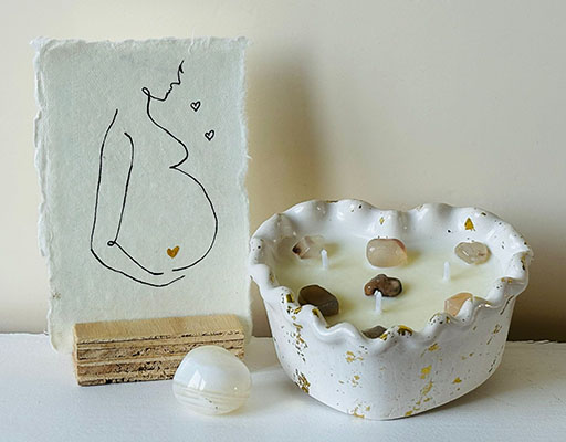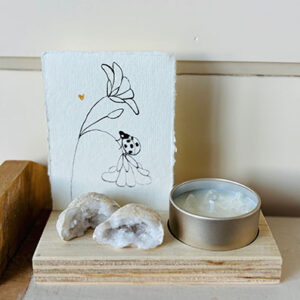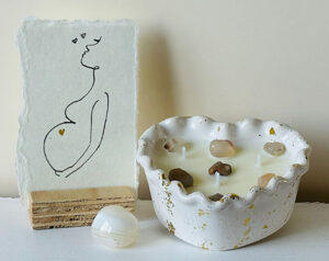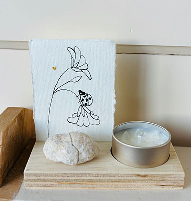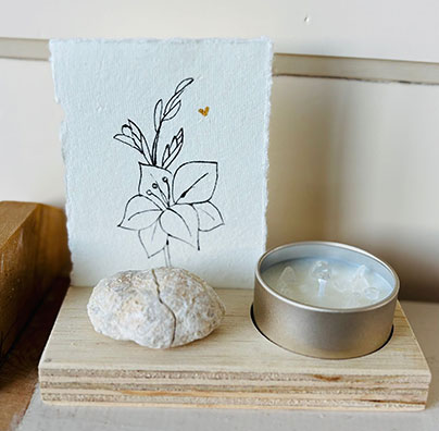 Roos verkoopt handgemaakte, natuurlijke geurkaarsen. Gemaakt van sojawas en etherische oliën. Mild van geur en met prachtige edelsteentjes. Voor haar kaarsjes die zij speciaal voor zwangeren heeft gemaakt, heb ik passende kaartjes mogen maken. Ook bij kaarsjes speciaal voor troost heb ik vier kaartjes gemaakt. Een handgemaakte lijntekening met een kroontjespen en Oost-Indische inkt op handgeschept papier, met een gouden detail van acrylverf.